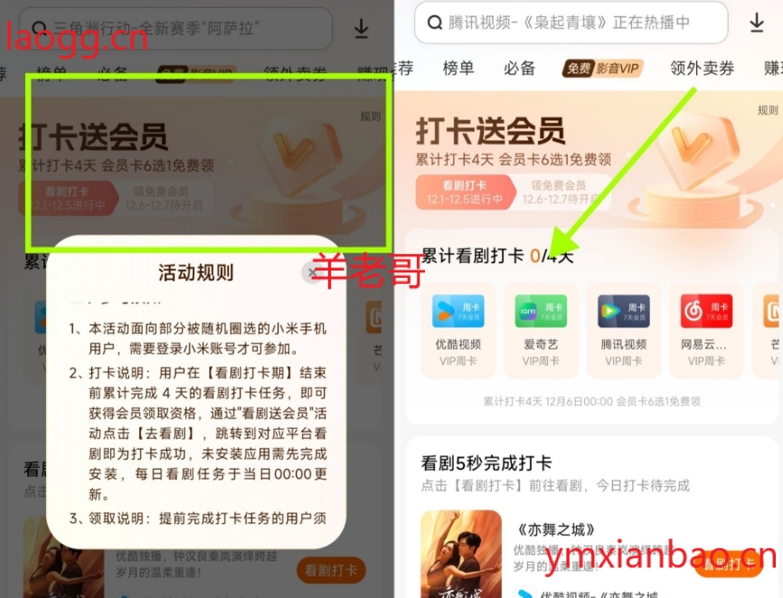 小米视频app首页横幅-打卡送绘员-,连续打卡累计四天可领绘员6选1