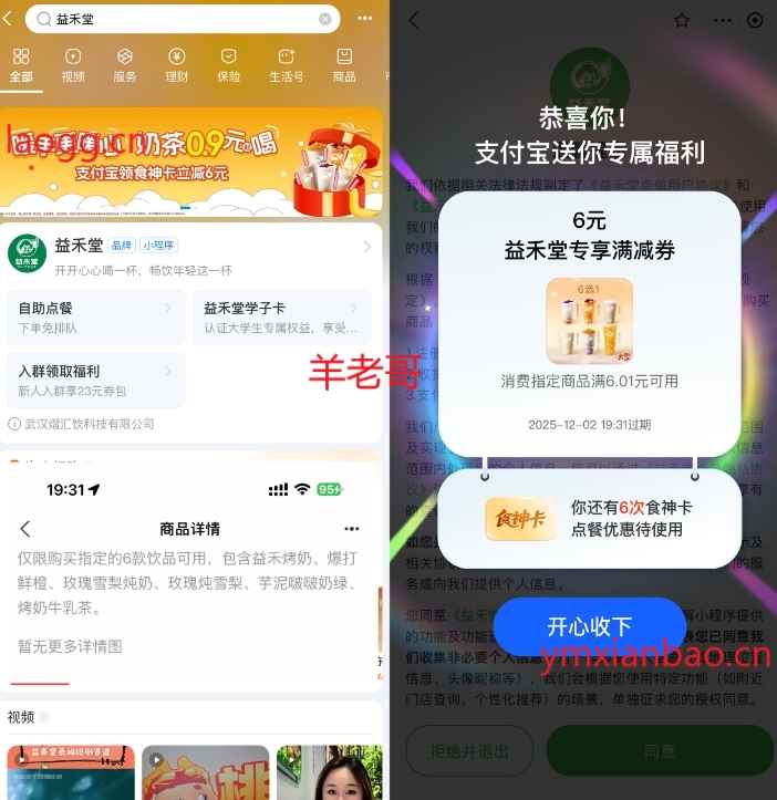 支付宝搜索“沪上阿姨/益禾堂”,点横幅进入自动弹6亓券,支付时才可看见抵扣