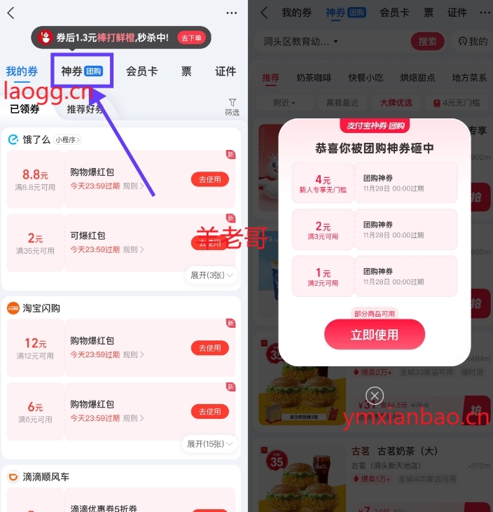首页“卡包”-顶部“神券”-进入自动弹4亓无门槛券,有很多0.01~1亓的奶茶可买