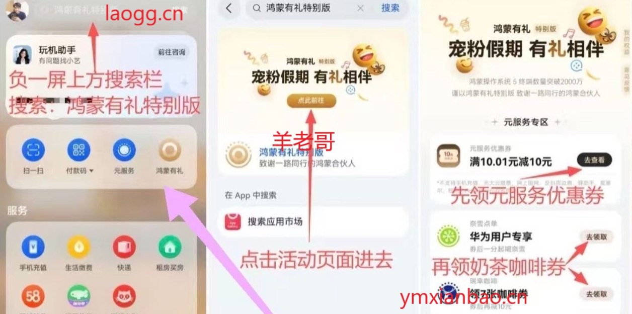 华为鸿蒙手机,桌面右滑到【负一屏】,鸿蒙有礼,日日有礼截12.12日,每周三、四、五可领10-10支fu券,限周五使用(每周可领3张,1天领1张),限鸿蒙5.1及以上版本可参与,点外卖/奈雪/电费等都能用