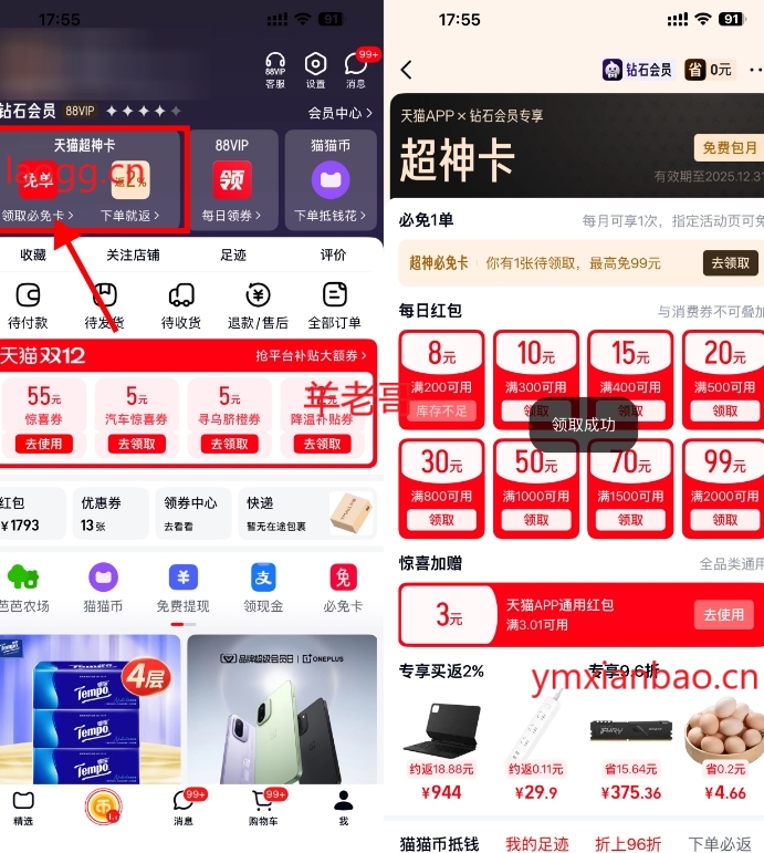 天猫APP底部“我的”,天猫超神卡,每周可领3~5亓无门槛