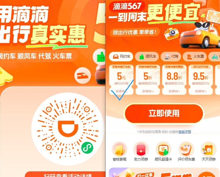 一:滴滴出行周五六七部分五折券+10无门槛: