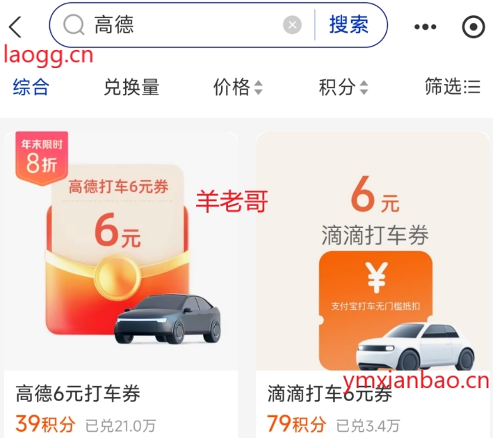 支付宝搜:支付宝会员,进入后 再搜:高德,有39积分兑高德6亓打车卷,也有79积分兑滴滴6亓卷