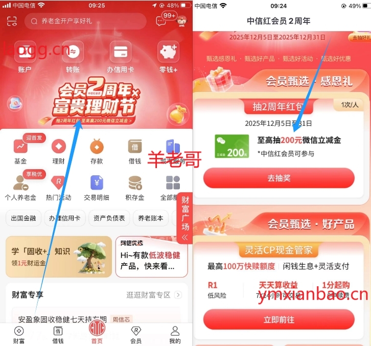 中信app首页顶部横幅两周年抽最高200立减金,下拉还有一个签约三方存管50,有能力的可以看下,签约三方的是下个月发