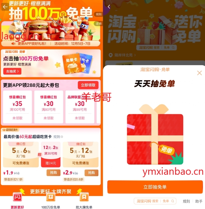 淘宝闪购APP搜索“免单”(饿了么APP 正式更名为淘宝闪购APP),12月5日~7日每天抽100万份免单