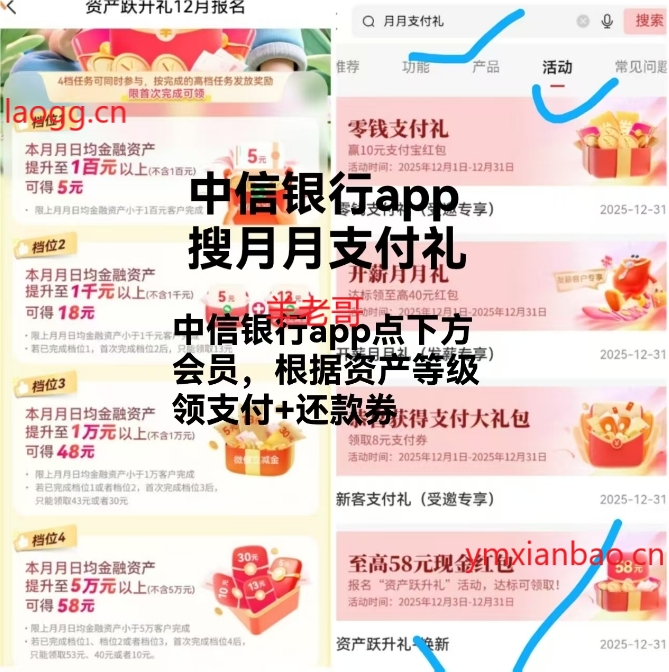 中信app搜:月月支付礼,下拉活动找到至高58,需要一二类实体卡才可以报名,按能力提升日均资产有对应立减金
