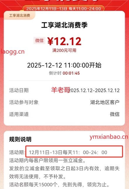 限湖北工行,11-13号每天11点开始,app搜索消费季,有200-12.12微xin立减金一张