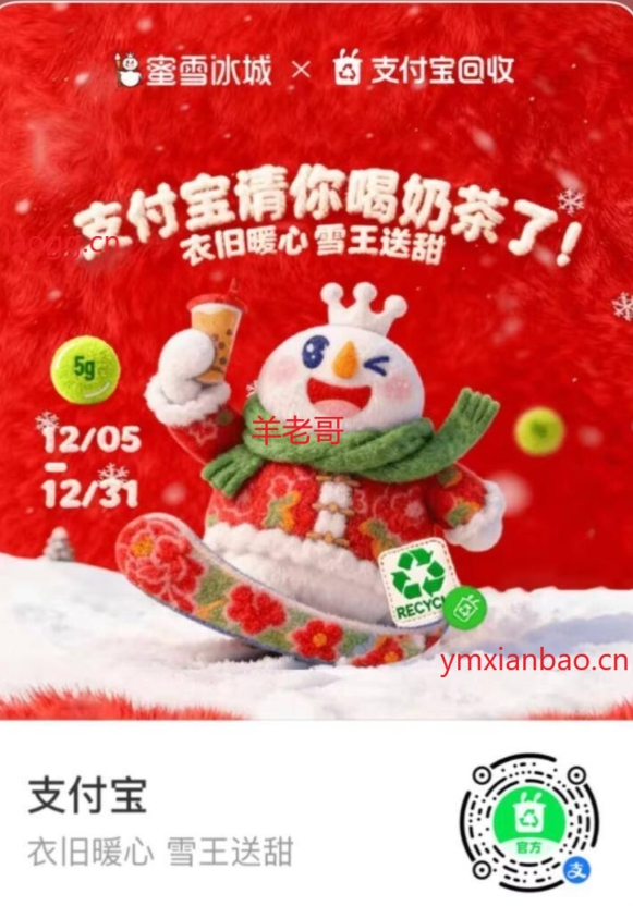 支付宝搜:回收喝蜜雪,31截止,进入页面可预约上门回收旧衣,订单完成后可获得蜜雪6亓无门槛券。自动发放到zfb卡包,共5.9w份,每个用户仅限完成一次