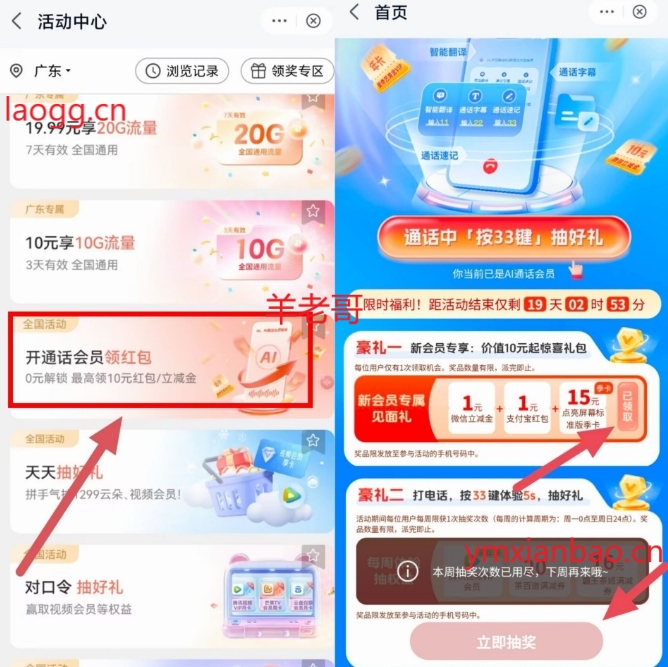 中国移动云盘app,限移动用户,活动中心如图开通话荟员,开通后可领1亓微xin立减金和1亓zfb立减金,页面还有打电话给指定的AI通话,机器人接通后输入33,等几秒后回来抽,每周都可以做