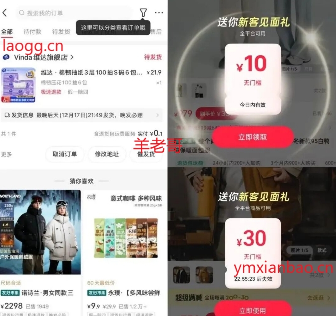 小红书app进市集搜:羽绒服,随便点个商品进去,部分号弹10-30无门槛卷,非必中,领到10卷可0入6包维达抽纸