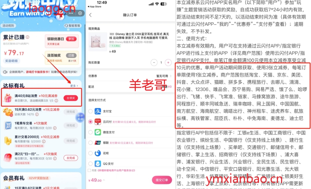 芸闪付app搜玩赚中心,找到达标有礼100-10券,券基本涵盖所有线上商户(水电/外卖/购物等等),达成:哔哩哔哩APP-底部会员购,买大于40块的东西(别选带定金的,不给退),唤醒芸支付,领券后回哔哩哔哩退订单。