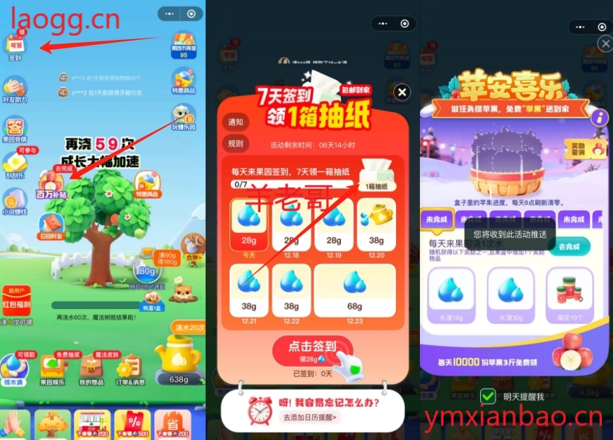 美团app搜:小美果园,有两个实物,百万补贴-抽3斤苹果,每天1W份,共6W份,不出现的,浇水完重进下,22截,18号麦粉1kg和20号大米1kg,如图左上角签到-部分号签到7天 ,0亓鸡蛋/纸抽