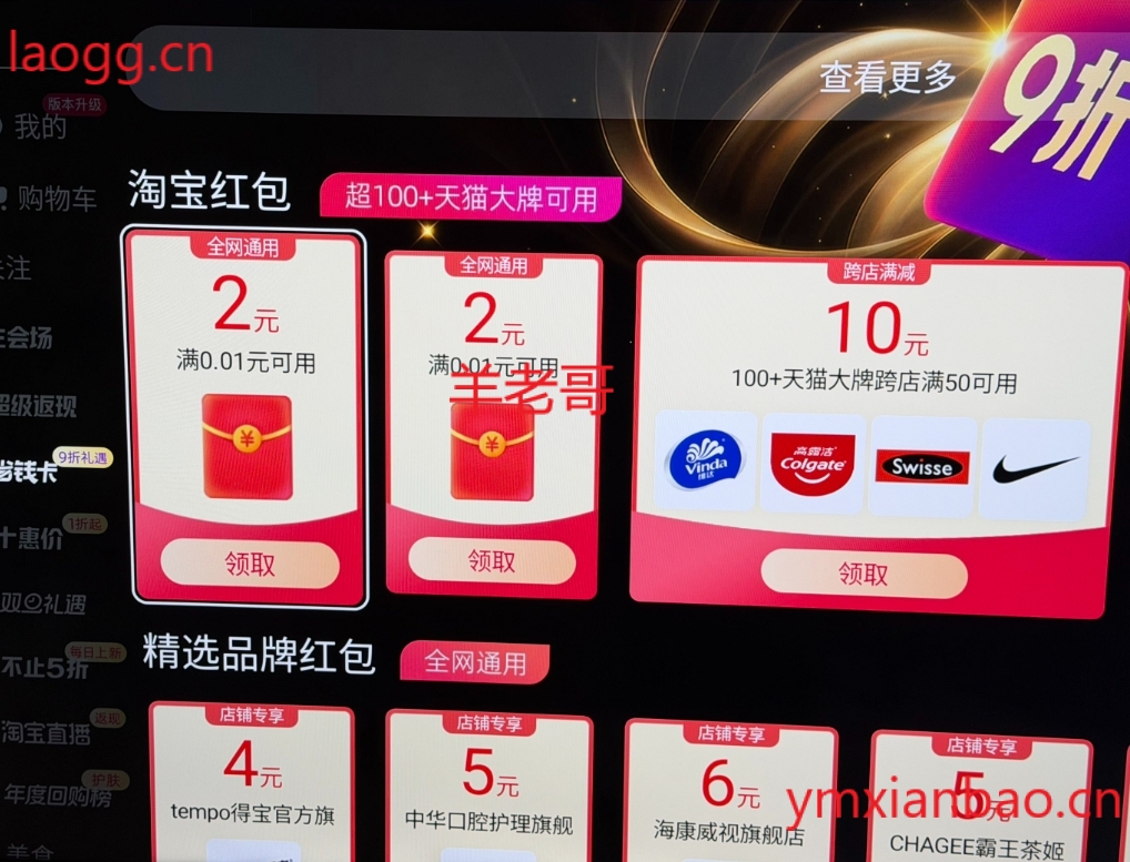 打开电视的淘宝APP,左侧“省钱卡”,直接0亓开通,下拉领2个2亓无门槛荭包