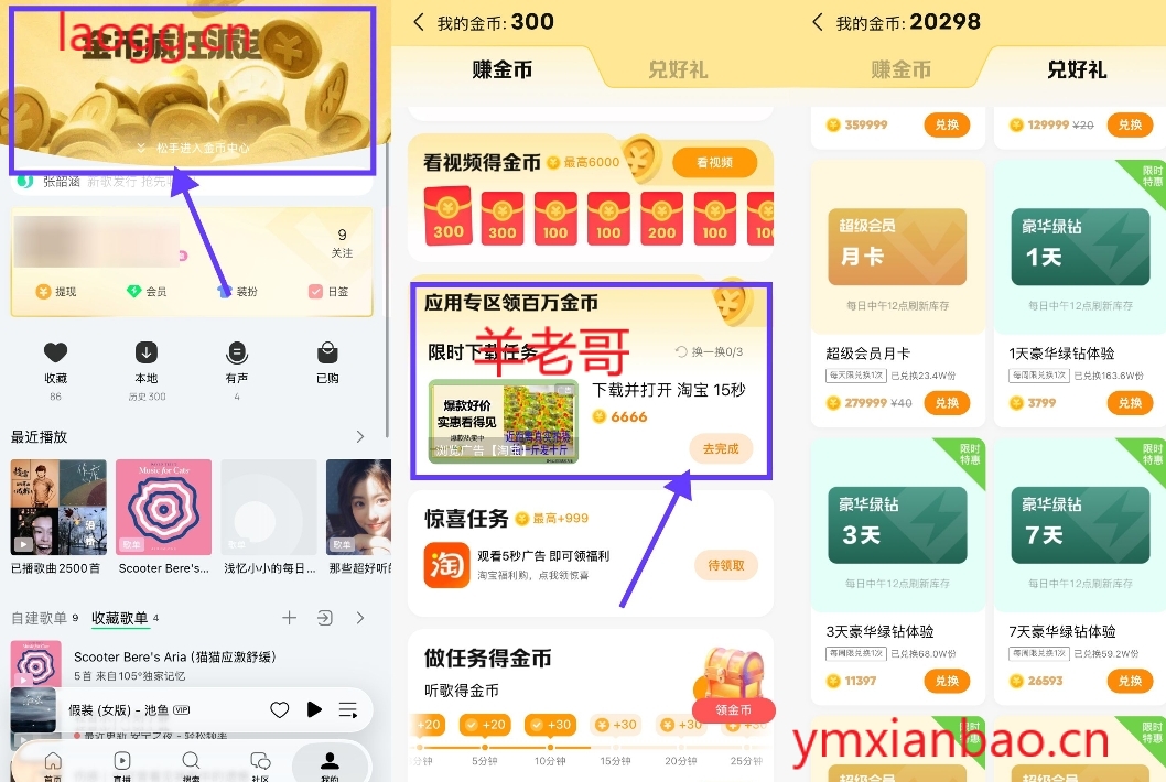 QQ音乐底部“我的”,顶部下拉进入金币,简单浏览得多个6666金币,可兑1~7天绿钻