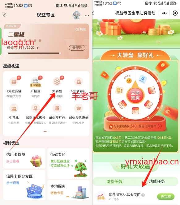 邮储app,我的,权益专区,大转盘,下拉拿金币再抽一次