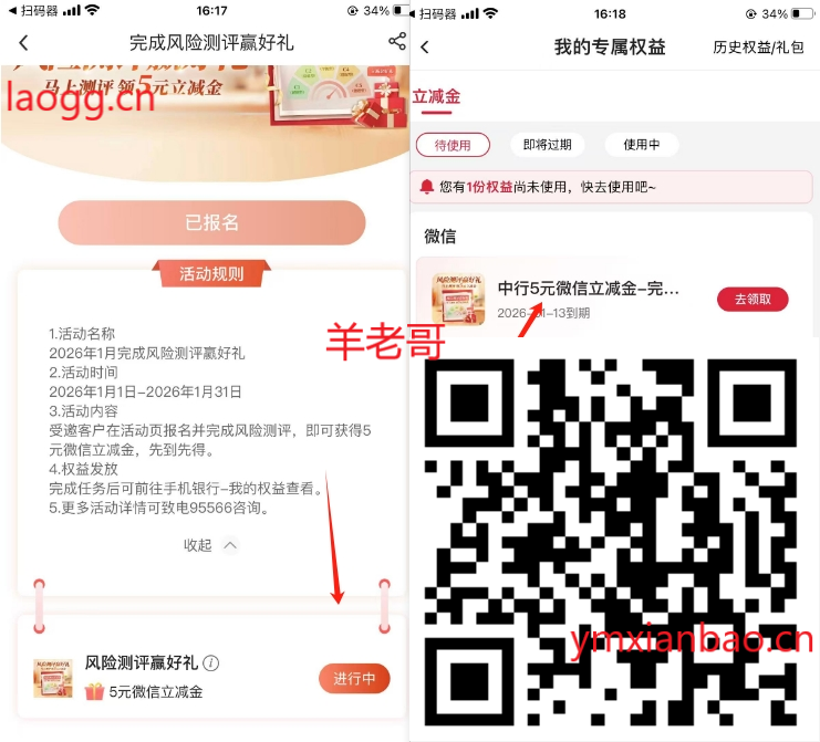 微xin识别跳转中行app,先报名,简单测评一下,完成去app-我的-权益中心找立减金