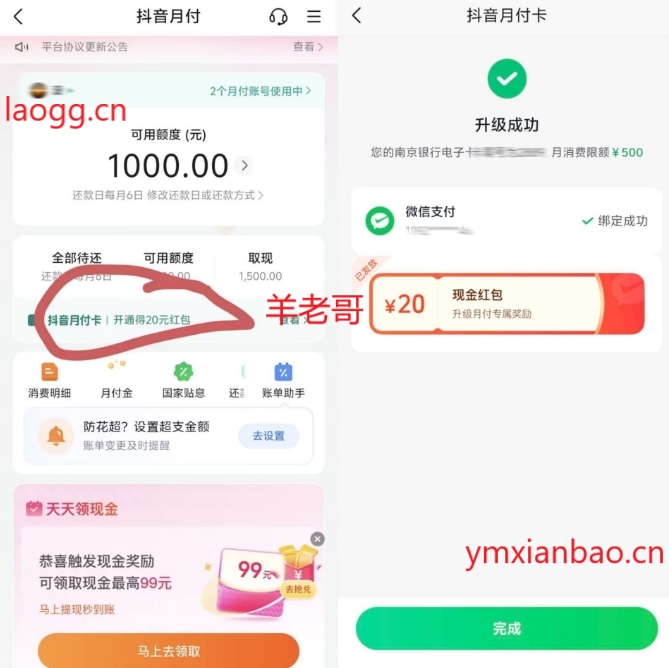 抖音部分月付升级20亓零钱