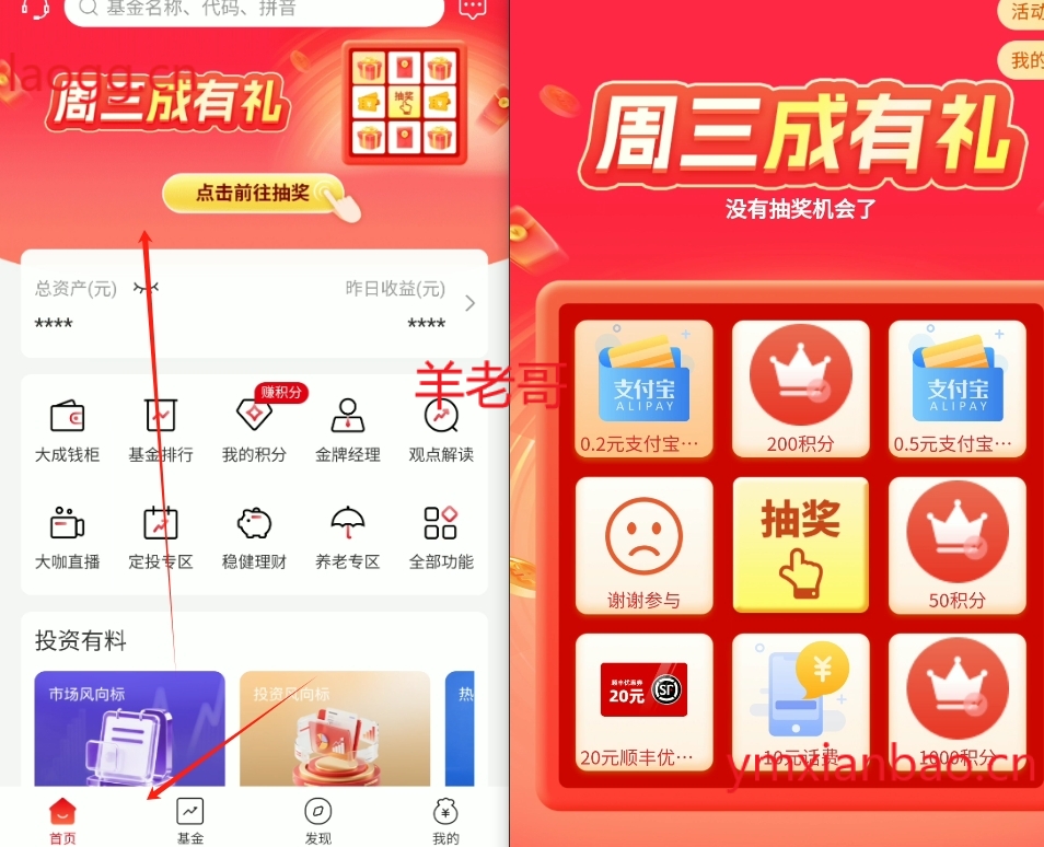 有开通过大成基金的老用户,打开app就会出现弹窗,登录后直接抽奖即可!不弹窗的左上角头像->活动中心进入->抽中根据页面提示去兑换即可
