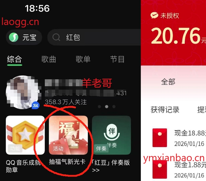 qq音乐搜:荭包,如图第二个点进去,建议攒够10次10连抽,有随机零钱或者绿钻体验卡。