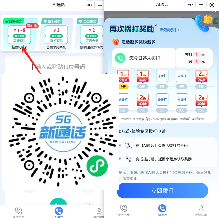 微xin识别,新的一月更新10天,每天坚持打,达标就可以领,自己任意一个号接通就行,最多十天加起来8