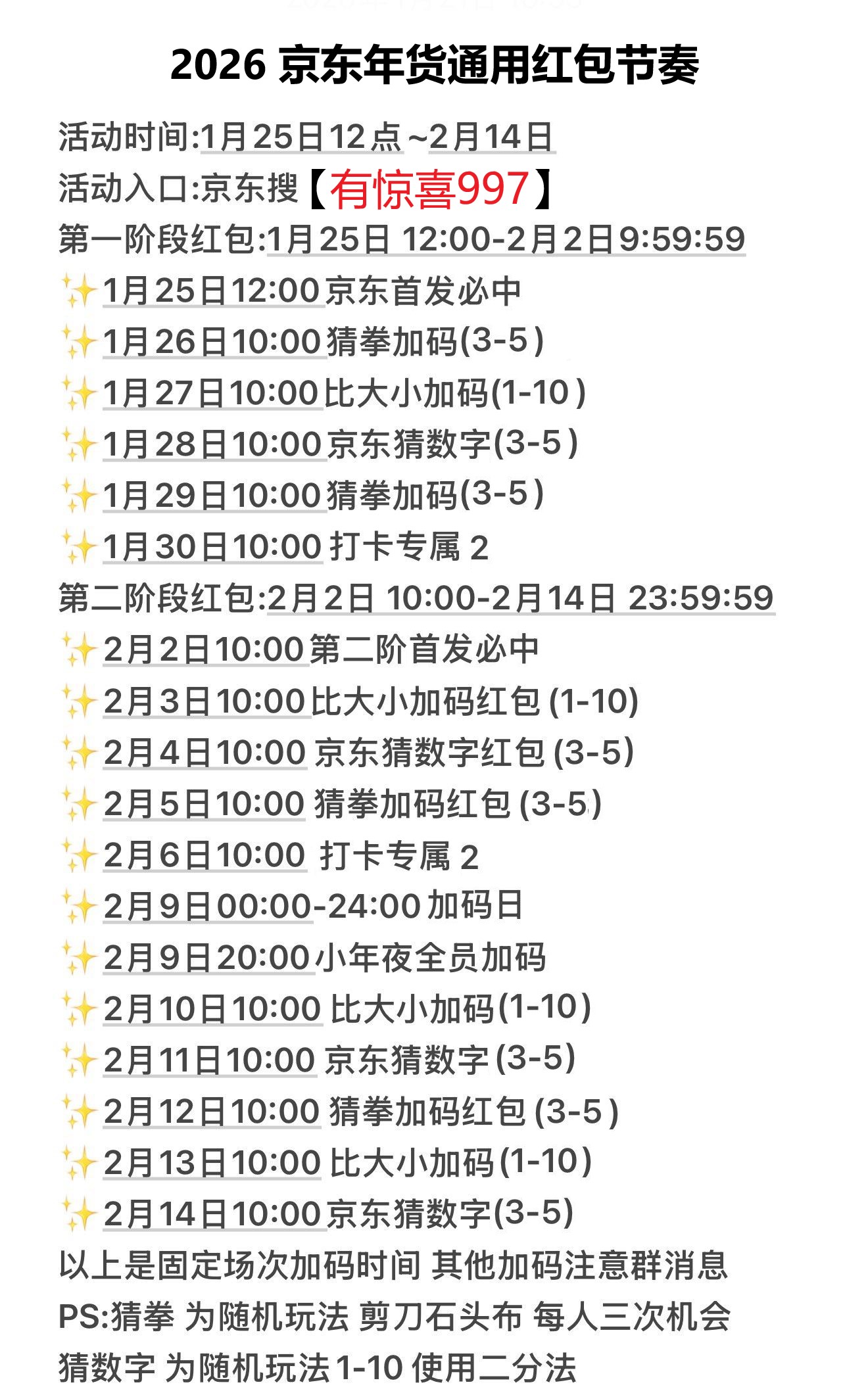 京东app搜索“有惊喜997”,每天反复进去抽3次,每抽1次再重新搜索进去抽,可以领多次,很多一分包邮实物,拆分使用也可以叠加使用,做任wu集火力每天再领12,都是无门槛的可以叠加。以下为新年货节期间活动明细以及加码活动。(时间点到达后重新搜索就可以参加)