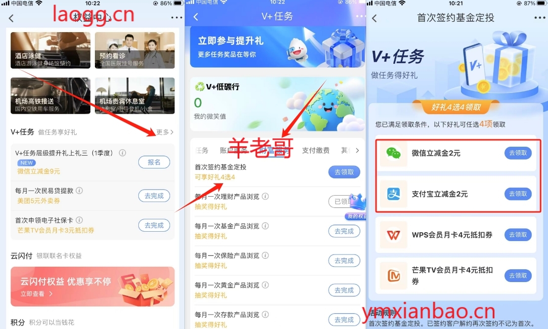 民生app,我的,权益中心,V+任务,财富服务,找到首次开通定投领2+2立减金(搜我的定投关闭)
