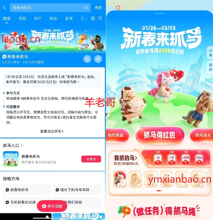 抖音搜“新春来抓马”,打卡发视频得次数抓马,累计集齐3/5/7/9种马,分别得5/10/200/2026亓