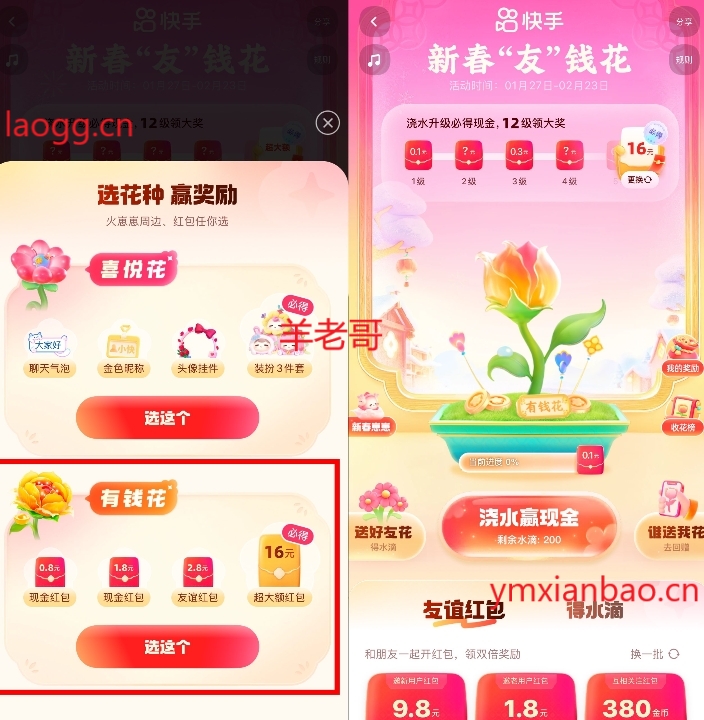 快手搜索“新春友钱花”,送花给好友得水滴升级,达到12级可得16亓零钱