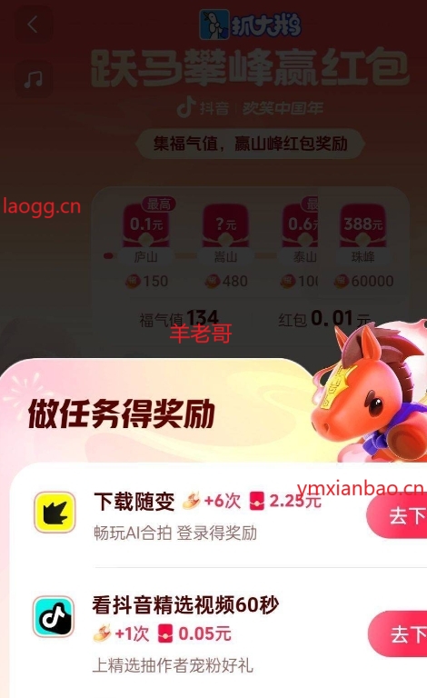抖音搜:跃马攀峰,目前部分人能进,截3.3日,任务攒福气值,达到不同10个节点,有对应领最高共388,有反馈到达玉龙雪山是145,具体玩法就是狂点+左右手机晃动攒福气值,比较耗时间,建议可用筋膜枪不累手,连点器可能会黑号,视情况玩