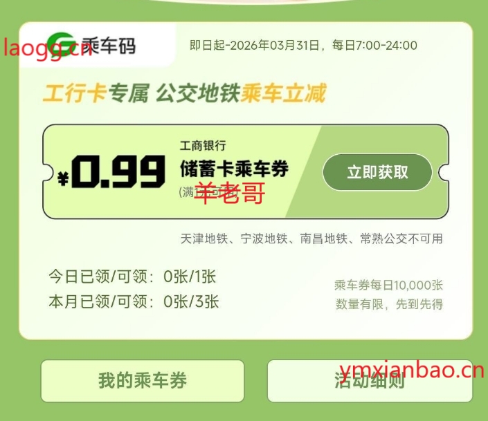 工行公交地铁券:#小程序:工享好礼,每天1次,每月限3次,芸闪付工/邮储/建行也有优惠以上每月4次,天1次