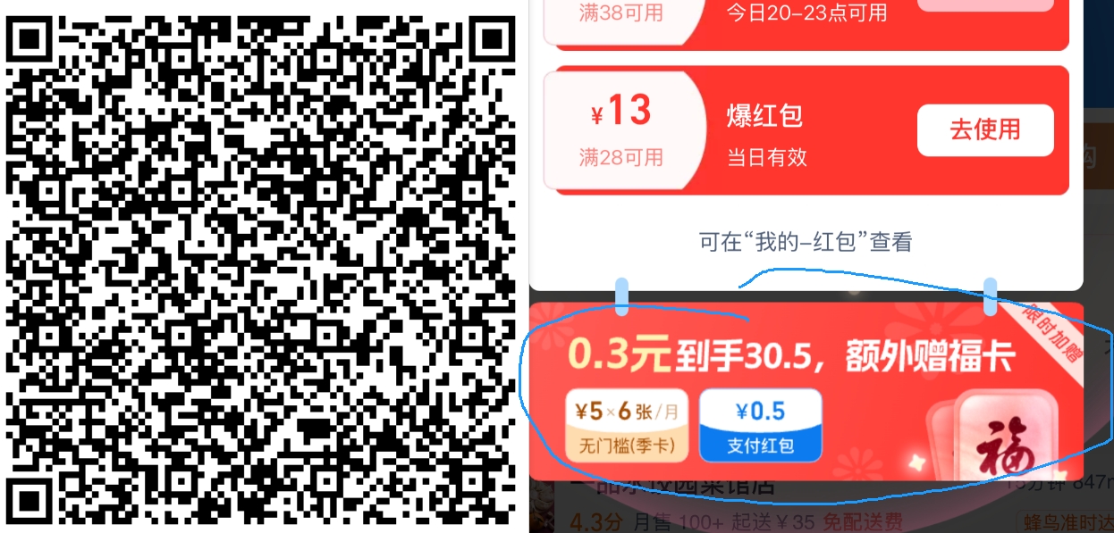饿了么0.3购5*6+0.5亓支付荭包(淘宝闪购)