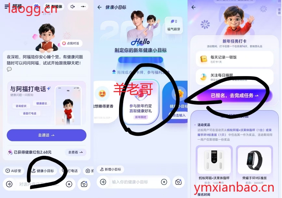 蚂蚁阿福app -新年小目标,打卡14天送实物,今天开始去,实物很多,10w份体脂称+3.8w荣耀手环,没下过的从五福入口进还有随机立减zfb搜集福卡或识别直达,右上角健康荭包,去阿福自动弹,去zfb卡包找,线下店通用