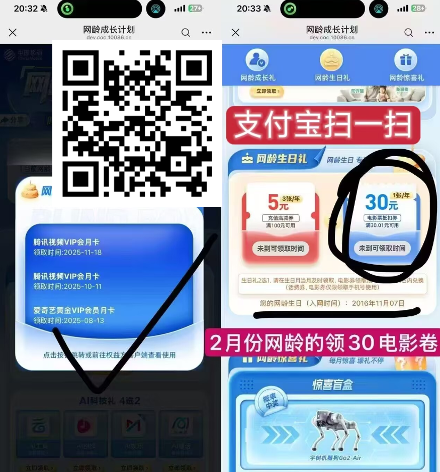 移动下拉2月网龄的30电影票,如果不是2月网龄的每月有流量包可以领