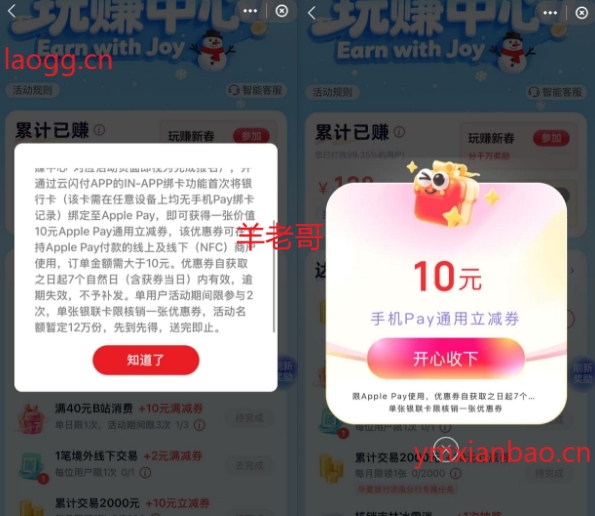 芸闪付app,搜玩赚中心,找到Apple Pay绑卡,按步骤任意两张卡绑上即可,10亓券可以线上也可以线下用,如美团/京东等使用Apple Pay
