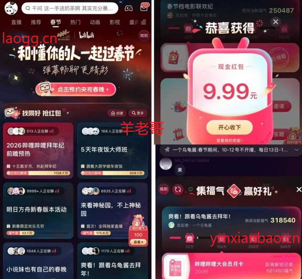哔哩哔哩app顶部切【春节】每个直播间,都有不一样的实物/E卡/现金抢,在右下角“福气”点开,快到达福气值时,快速刷新去抢,难度挺高的,拼手速