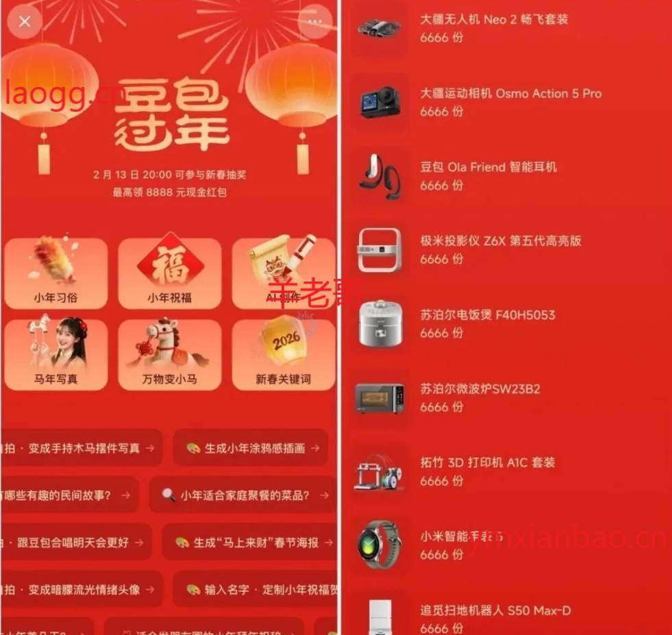 2.13日晚20点 正式开始,截16日12点,完成互动,可抽最高8888亓零钱,春晚抽奖环节:2.16日除夕当晚,通过主持人指引完成互动,可抽10w份实物/现金,有大疆/极米/小米/苏泊尔等大牌,都是值钱好东西,会提醒