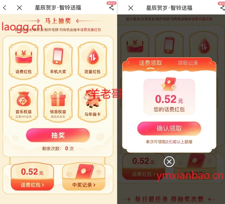 电信app首页-天翼智铃,页面进入送五抽,下拉做完任务,能得2亓多,满2亓能提话费,