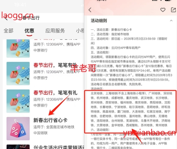 云闪付APP搜:新春出行,找到新春出行省心卡,乘车码在指定城市乘坐地铁,通过62开头银联卡支付可享立减0.5元优惠。每份“新春出行省心卡”含10张优惠券,每日限享1次优惠,使用有效期为领取后15*24小时。单用户活动期间限领取一次