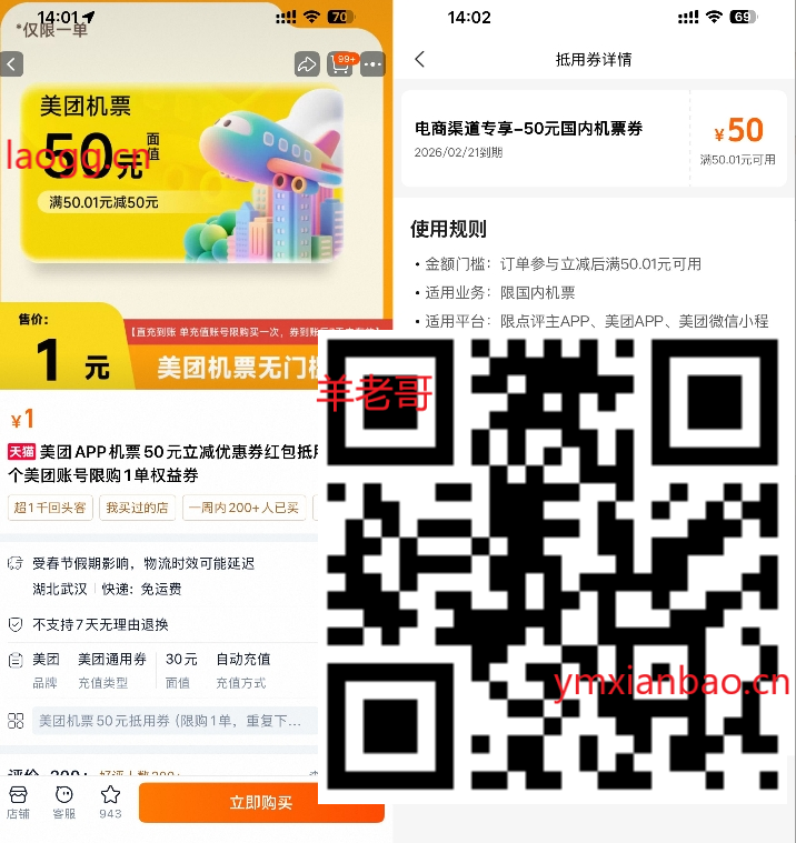 淘宝1亓购美团50亓机票券