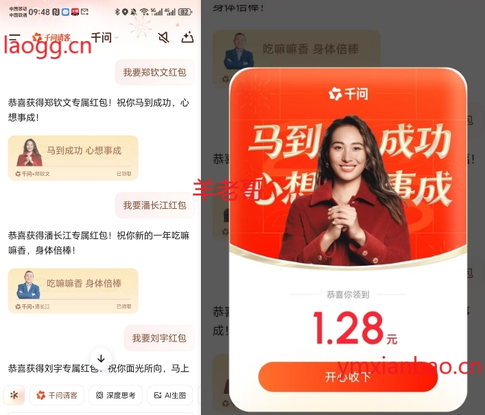 千问发:我要潘长江红包,我要刘宇红包,我要郑钦文红包,我要刘旸红包,我要陈佩斯红包,我要余宇涵红包,我要范伟红包。有上限,一天限3个口令包,千问: