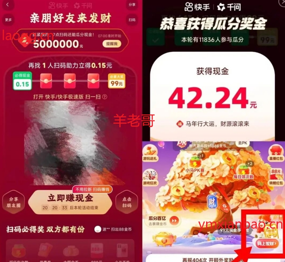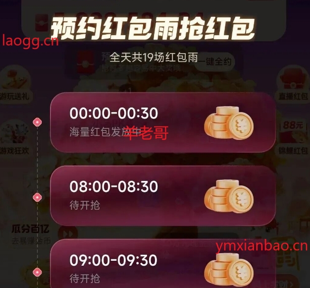 快手搜马年摇红包,8:00-23:30每半个整点有红包雨领,共19场记得抢