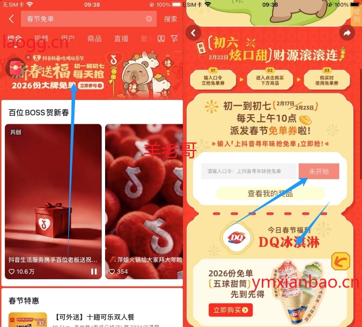 抖音搜:春节免单,口令:上抖音寻年味抢免单,10点抢2026份沪上免单券