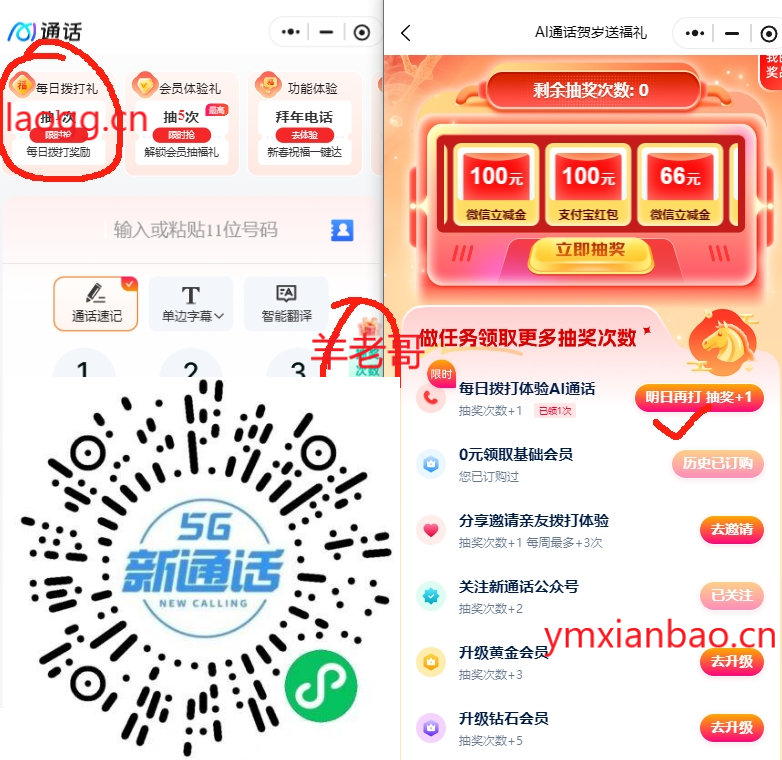 微xin识别,新一期限移动用户,顶部完成打一次电话,返回领次数抽,需在5g网络打