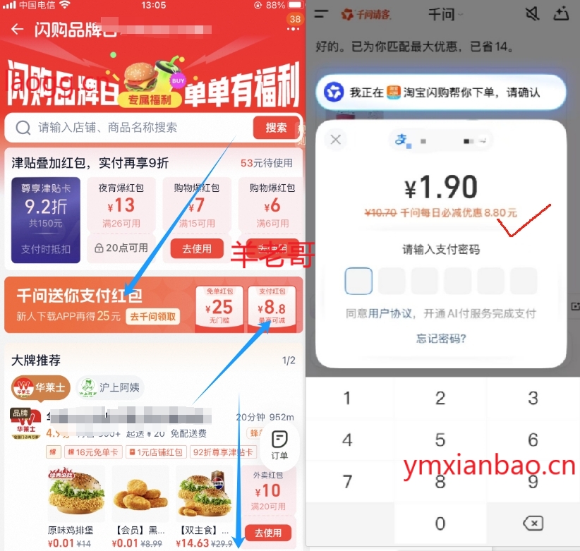 淘宝app切闪购搜11142,1:页面下拉找到想吃店,领叠加的商品卷(有的店没有),2:再点横幅千问送你支付荭包跳转千问,跳转到千问即可支付使用,这样一单会比平时低5-10亓,最高立减支付8.8(优惠前显示)