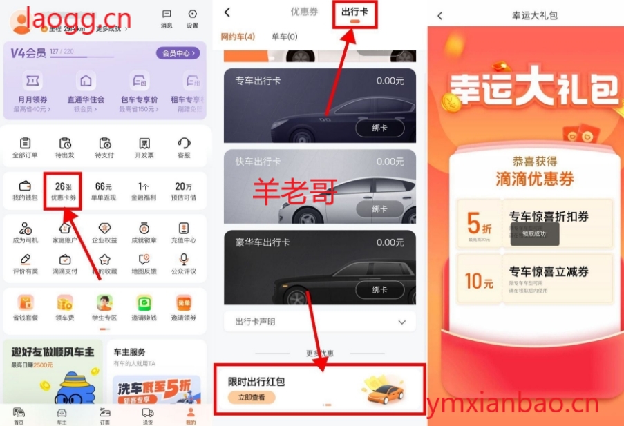 滴滴APP底部“我的”-优惠卡券-顶部“出行卡”-下拉限时出行,每天可领10无门槛专车券