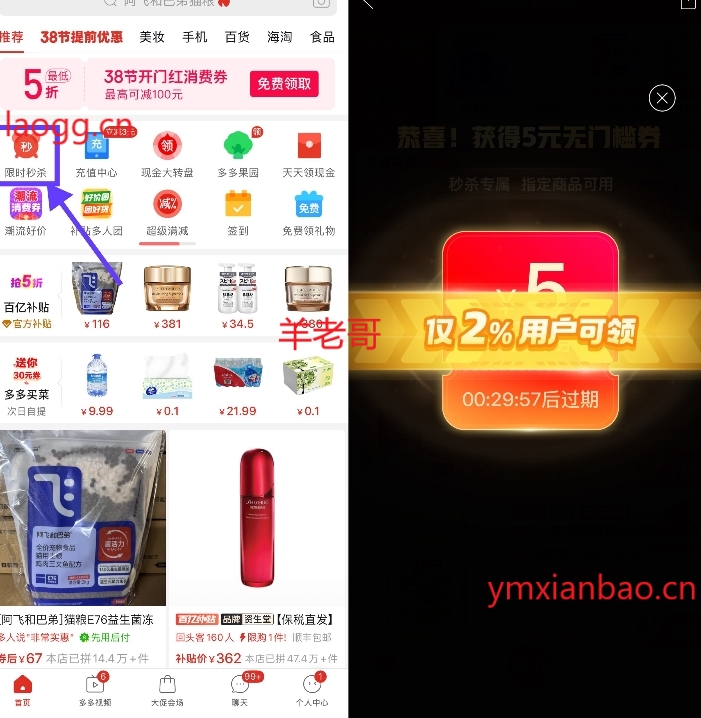 拼多多APP首页“限时秒杀”,如果有弹出5亓券,页面任选一个实物去买就行了