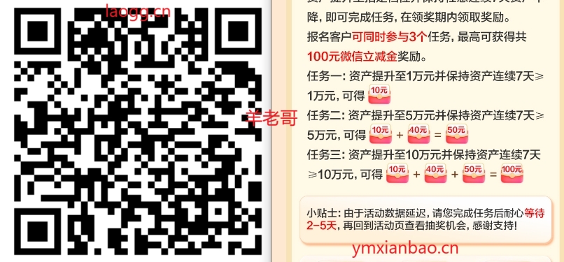 微xin识别,先报名,对应金额放7天分别10/50/100亓微xin立减金,提示没名额的问问客户经理 同时:建行2.28号转入对应资产一天,需要比2.14当天高就可以,对应5-200亓微xin立减金,最低档1w
