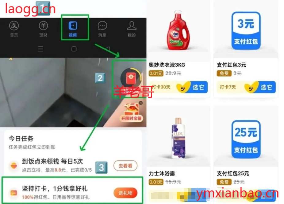支付宝-底部视频-如图进,部分人才有任务,打咔7/30天兑3/25亓立减金,还有打咔对应天数一分换实物等