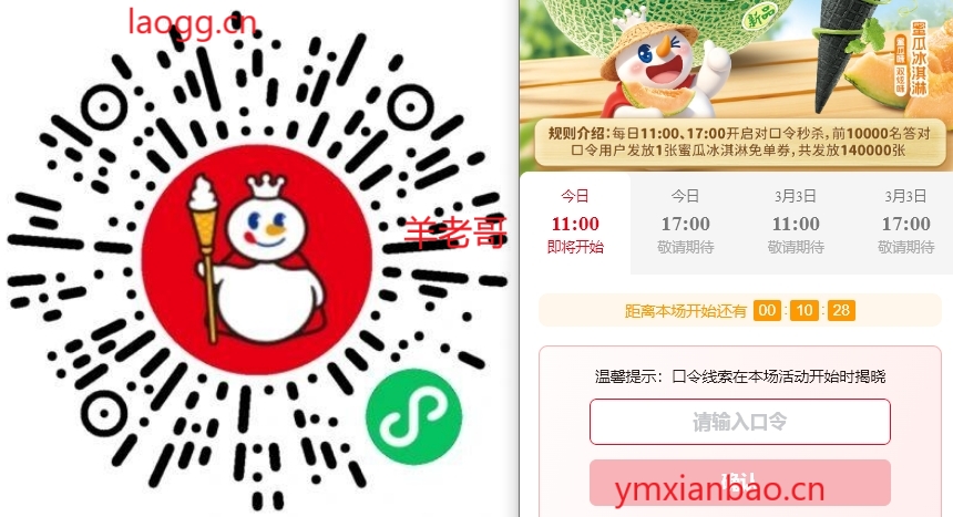 微xin识别,11点/17点蜜雪各抢1w冰淇淋,页面开始时有提醒口令