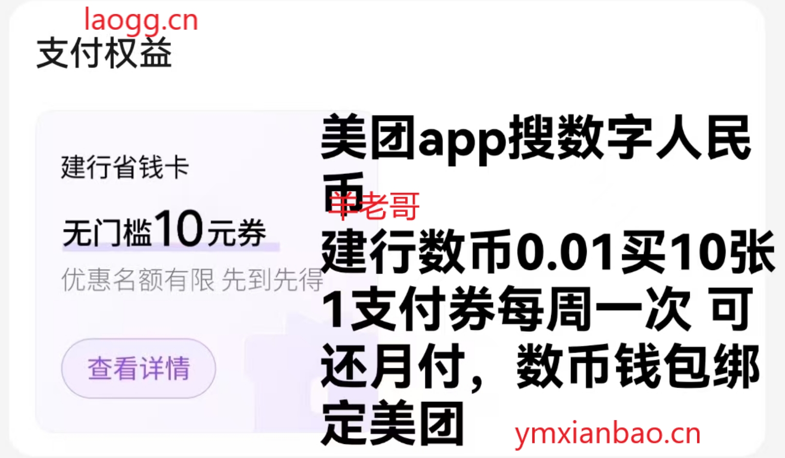 美团app搜数字人民币,建行数币0.01买10张1亓支付券每周一次,可还月付,建行数币钱包绑定美团